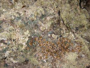 While there, I took this picture of brown carpet anemones and a competing green anemone elbowing one another for space among the algaes on this rock. My guess there is that they directly compete for space. This kind of competition is kind of a lottery (Sale 1977). Each time one dies, a prize spot opens up. Its (now former) neighbors have all bought all the tickets they could by producing as many little gametes as possible, which turn into larvae.