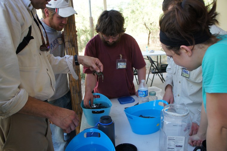The course instructor, who we’ll call Kevin, is in fact NOT eating this horned lizard. They are probably not good to eat, since they are one of the few vertebrates that can deal with ants’ formic acid, and survive on a diet of mostly ants. We did learn at Raven’s Way (our stopover in the Santa Rita mountain range) from Vincent Pinto that some other common small lizards can be a good food source in a survival situation, in addition to the invasive crayfish we caught and ate (pictured below). We also grazed Texas mulberry and ocotillo flowers and goosefoot out in the field. This was a more human and useful side of our ecology and natural history experience.