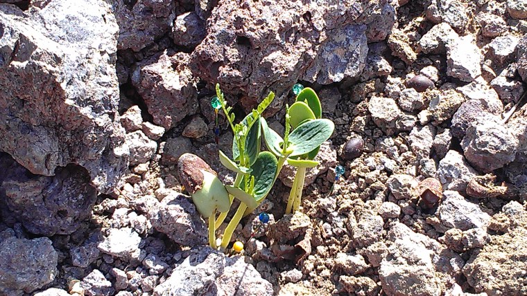 The seeds that survive the beetle onslaught are often in pods with siblings, so groups of up to five of these enormous, luminous, hilarious looking seedlings have been germinating in hollows throughout the volcanic slopes of the Tucson foothills. Consider five small seedlings in a space smaller than one tree. Only one can survive long enough to reproduce, clearly. So does this hedge the tree’s bets, or reduce the vitality of all the seedlings? Do trees that produce seeds in pods of 1-2 seeds do better than those dropping pods of four seeds at a time? These would be some interesting questions to investigate.