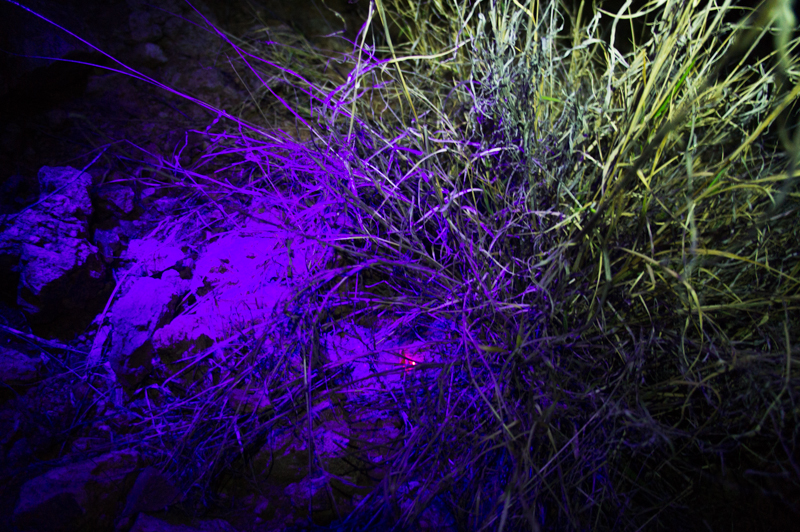 Fortunately, I brought a friend along who thought a night time hike in the desert with black lights sounded like a great way to see some scorpions, tarantulas, and other wildlife. (Lightning, too, as it turned out.) As we surveyed the second-to-last depot, he pointed at something glowing bright.