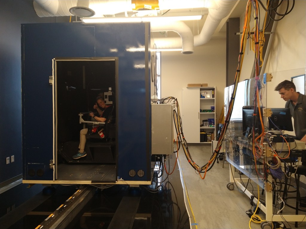 I recently got to check out research on gravity and balance by scientists at the University of Colorado Boulder. For example, Dr. Jordan Dixon and his colleagues have rebuilt NASA’s Tilt Translation Sled that accelerates on tracks as subjects inside tilt and respond to visual cues to simulate hovering a spacecraft. They also have a Mars landing simulation that can be used to explore manual flying performance after exposure to altered gravity environments! Check out the video of me “landing” on Mars below 🙂